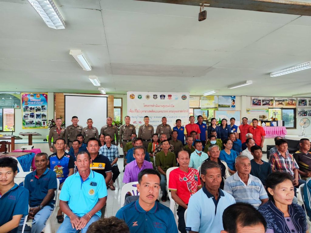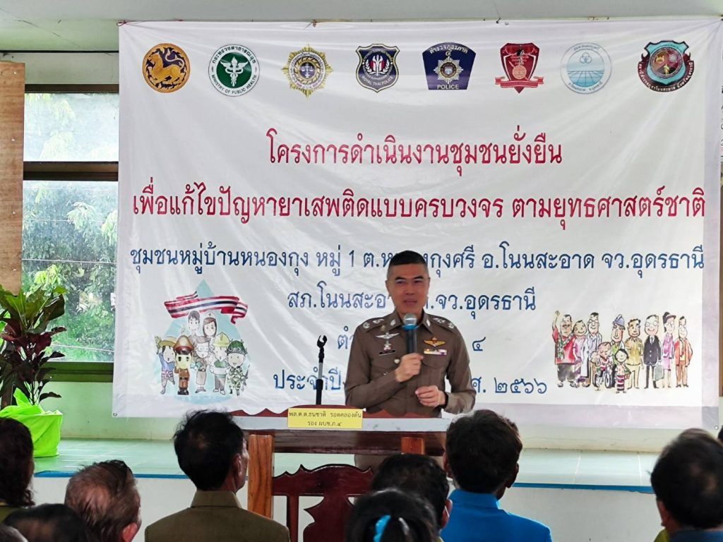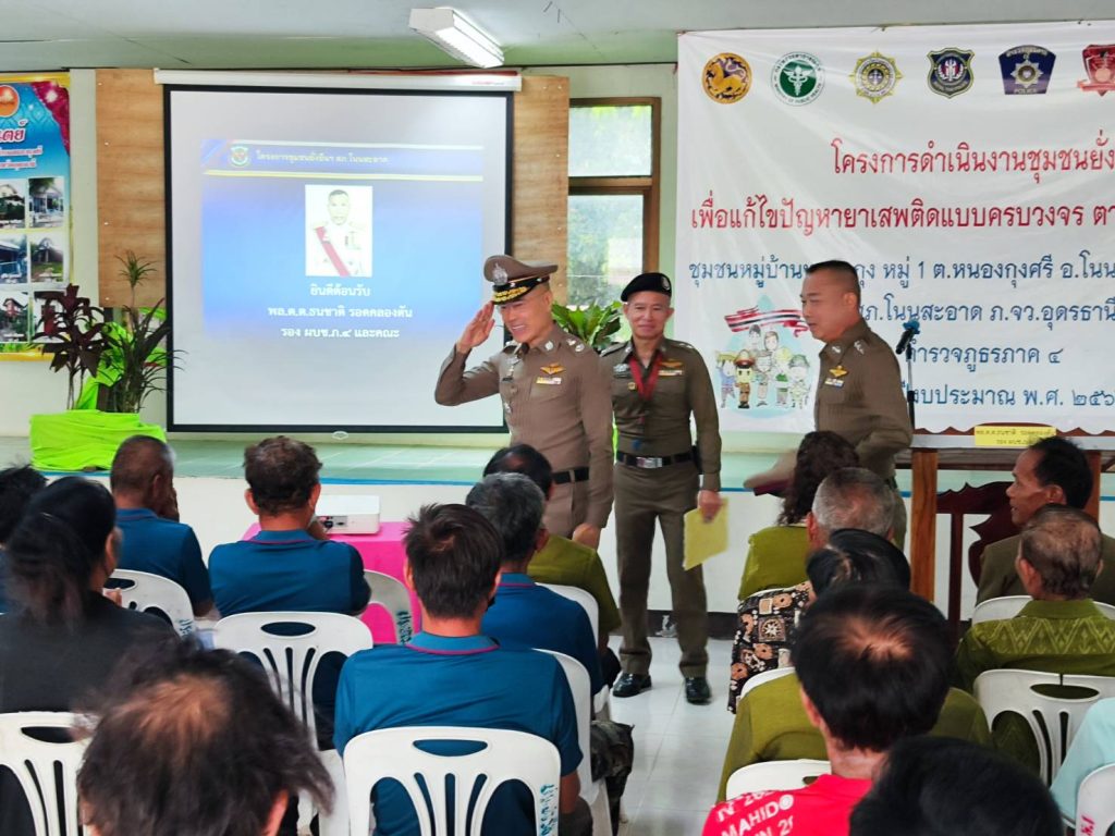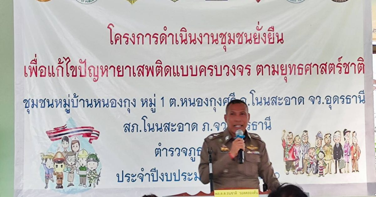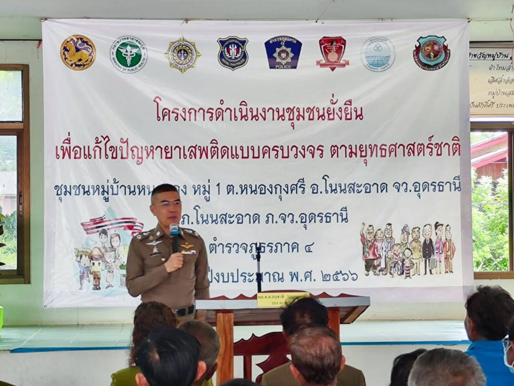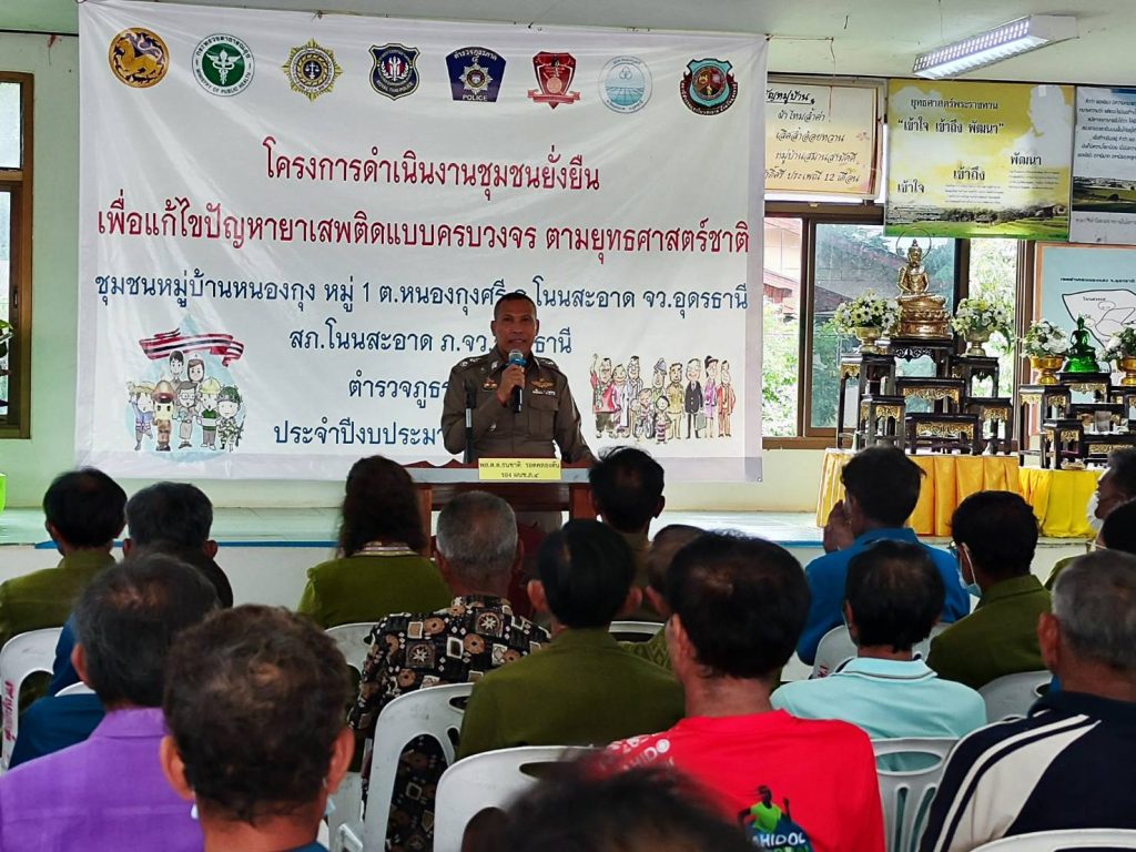 พล.ต.ต.ธนชาติ รอดคลองตัน รอง ผบช.ภ.4 พร้อมคณะตรวจประเมิน ได้เดินทางมาตรวจประเมินตาม “โครงการดำเนินงานชุมชนยั่งยืน เพื่อแก้ไขปัญหายาเสพติดแบบครบวงจร ตามยุทธศาสตร์ชาติ ประจำปีงบประมาณ 2566” บ้านหนองกุง หมู่ 1 บ้านหนองกุงศรี หมู่ 6 และบ้านหนองกุงทอง หมู่ 8 ต.หนองกุงศรี อ.โนนสะอาด จ.อุดรธานี โดยมี พล.ต.ต.พิษณุ อุณหเสรี ผบก.ภ.จว.อุดรธานี ,พ.ต.อ.นพดล เพ็ชร์สุทธิ์ รอง ผบก.ภ.จว.อุดรธานี, พ.ต.อ.นริศ เปี้ยกาศ ผกก.สภ.โนนสะอาด ,นายชวิศ ป้องขันธ์ นายอำเภอโนนสะอาด ,พ.ต.ท.ทวัช นิยมสุข รอง ผกก.ป.สภ.โนนสะอาด , พ.ต.ท.คมกฤติ สามแท่น สวป.สภ.โนนสะอาด พ.ต.ต.สรวิชญ์ ชวนนุรักษ์ สว.อก.สภ.โนนสะอาด พร้อมด้วยเจ้าหน้าที่ตำรวจชุดปฏิบัติการตามโครงการชุมชนยั่งยืนฯ สภ.โนนสะอาด นายก อบต.หนองกุงศรี ฝ่ายปกครอง เจ้าหน้าที่สาธารณสุข รพ.สต.หนองกุงศรี กำนัน ผู้ใหญ่บ้าน , อสม. ผู้นำชุมชน หัวหน้าคุ้ม คณะกรรมการคุ้ม ประชาชน และผู้เข้ารับการบำบัดตามโครงการ ให้การต้อนรับ และรอรับการตรวจประเมิน ณ ศาลาประชาอเนกประสงค์ ต.หนองกุงศรี อ.โนนสะอาด จ.อุดรธานี