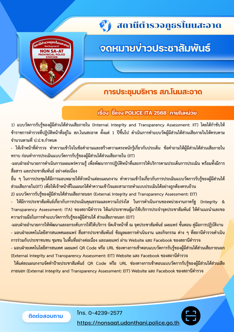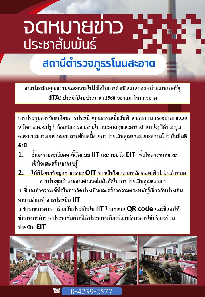 กิจกรรมที่ 1 : การประชุมชี้แจง เน้นย้ำ การให้ข้อมูลการประเมินคุณธรรมและความโปร่งใสในการดำเนินงาน ของหน่วยงานภาครัฐ (Integrity & Transparency Assessment : ITA )ของ สภ.โนนสะอาด