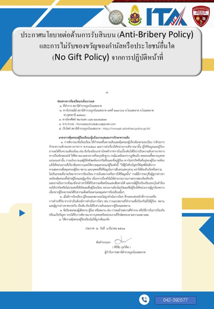 กิจกรรมที่ 4 : สภ.โนนสะอาด โดย พ.ต.อ.ศิริชัย กุลวิทิต ผกก.สภ.โนนสะอาด ประกาศนโยบาย No Gift Policy “งดให้ งดรับ” สินบน ของขวัญ ของกำนัล หรือสินน้ำใจ จากการปฏิบัติหน้าที่ เพื่อเสริมสร้างวัฒนธรรมการทำงานอย่างโปร่งใส